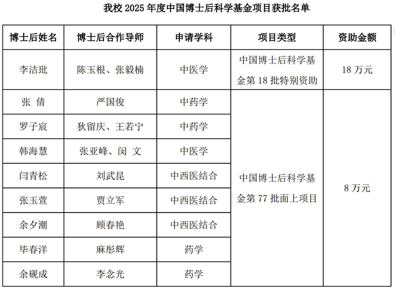 近日,中国博士后科学基金会公布了2025年度中国博士后科学基金第18批特别资助人员名单和中国博士后科学基金第77批面上资助人员名单,我校获批1项特别资助项目和8项面上资助项目,获批项目数取得学校历史性突破。