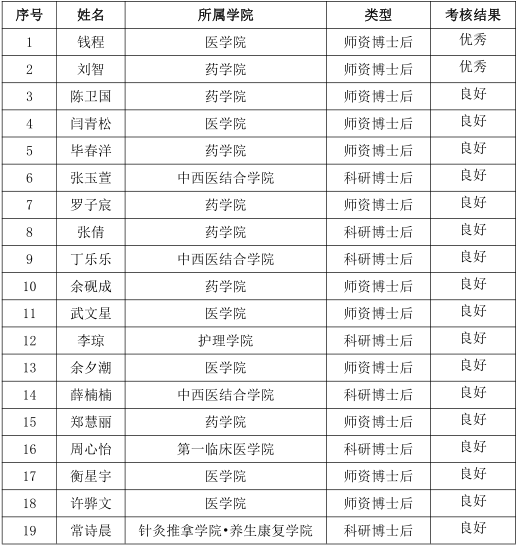 为强化博士后培养过程管理,根据《南京中医药大学博士后管理办法(暂行)》,针对在站满12个月的博士后,我校组织开展了博士后2025年度考核工作,通过个人述职汇报、专家组现场评审,以及合作导师评价评分,综合评定得出最终考核成绩。现将考核结果公示如下: